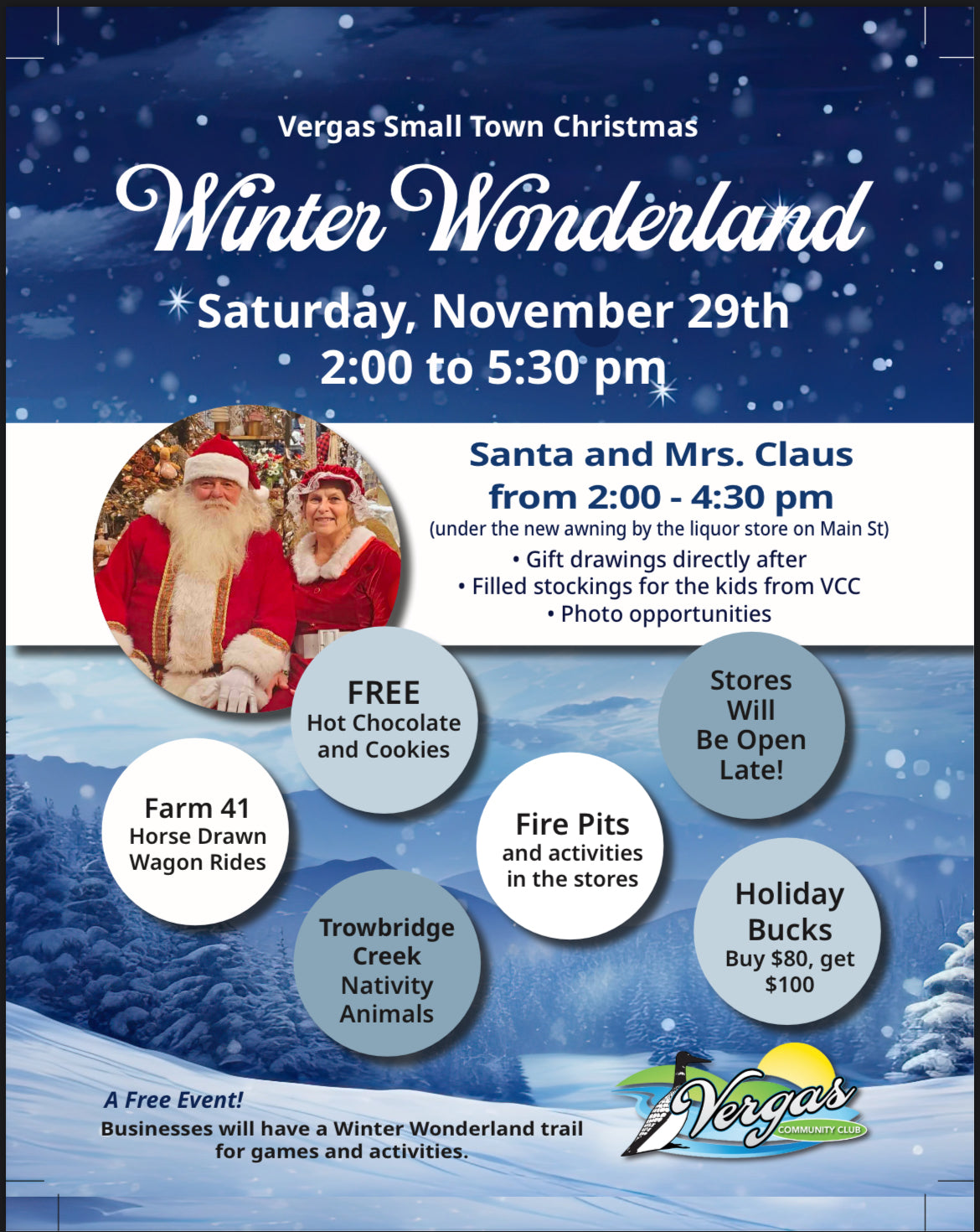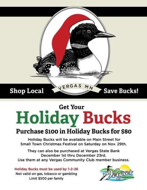 Holiday Bucks will be available on Main Street for Small Town Christmas Festival on Saturday on Nov. 29th. They can also be purchased at Vergas State Bank December 1st through December 23rd. Use them at any Vergas Community Club member business. Holiday Bucks must be used by 1-2-26. Not valid on gas, tobacco or gambling. Limit $500 per family.